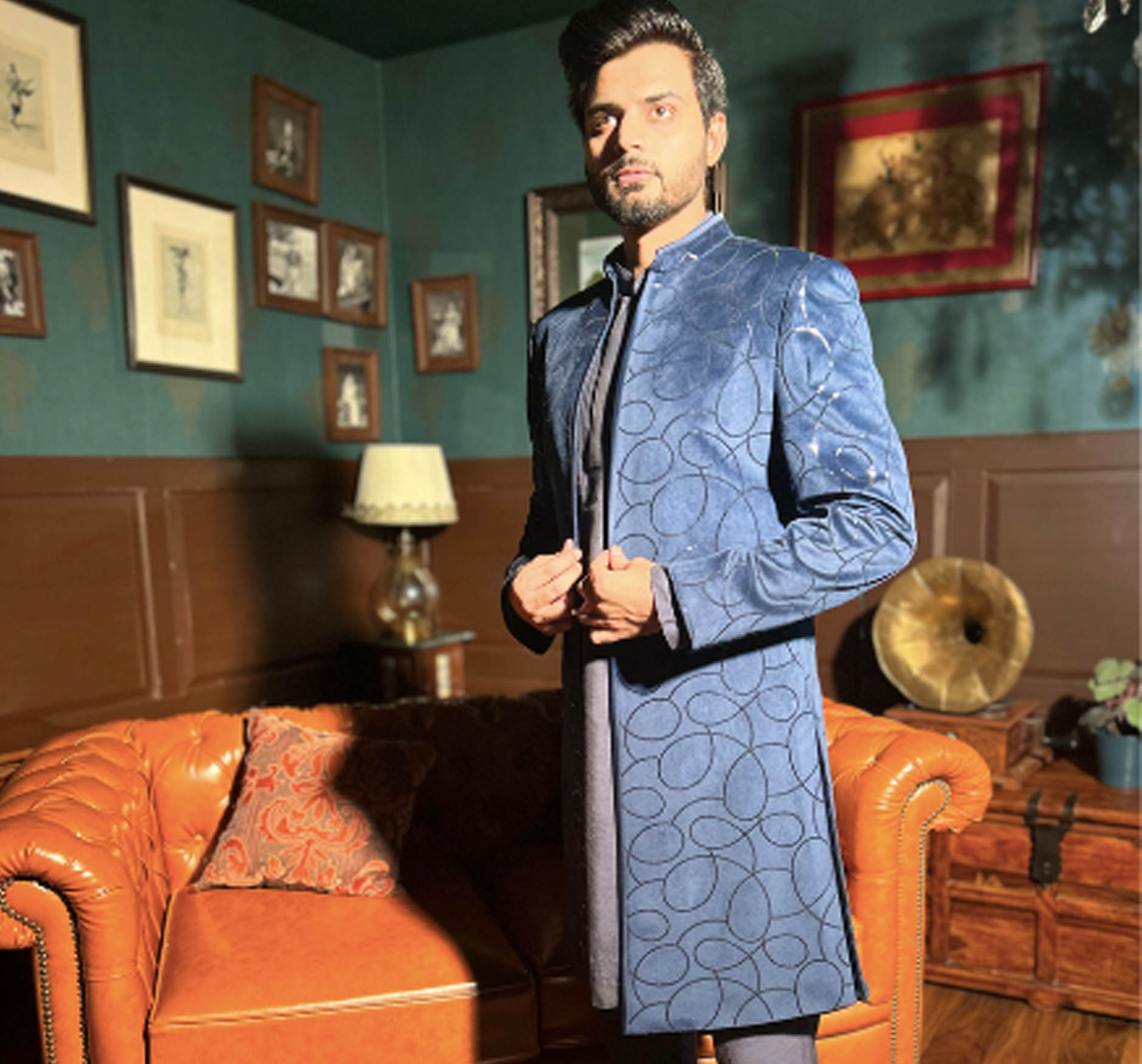 Wedding designer blue velvet indo western for men with blue kurta pyjama