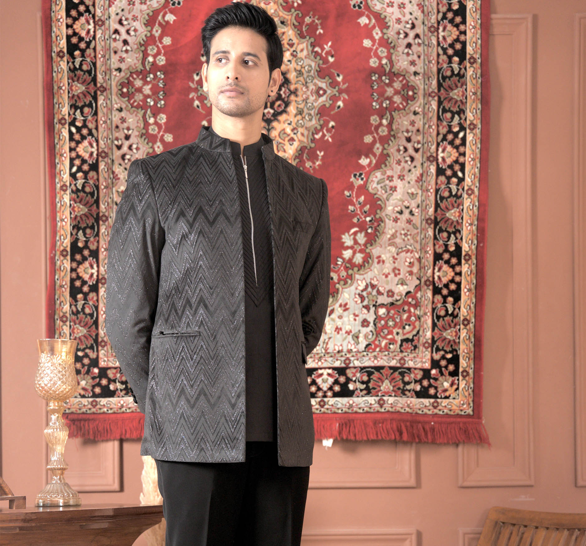 Black self embroidered bandhgala for men with short kurta
