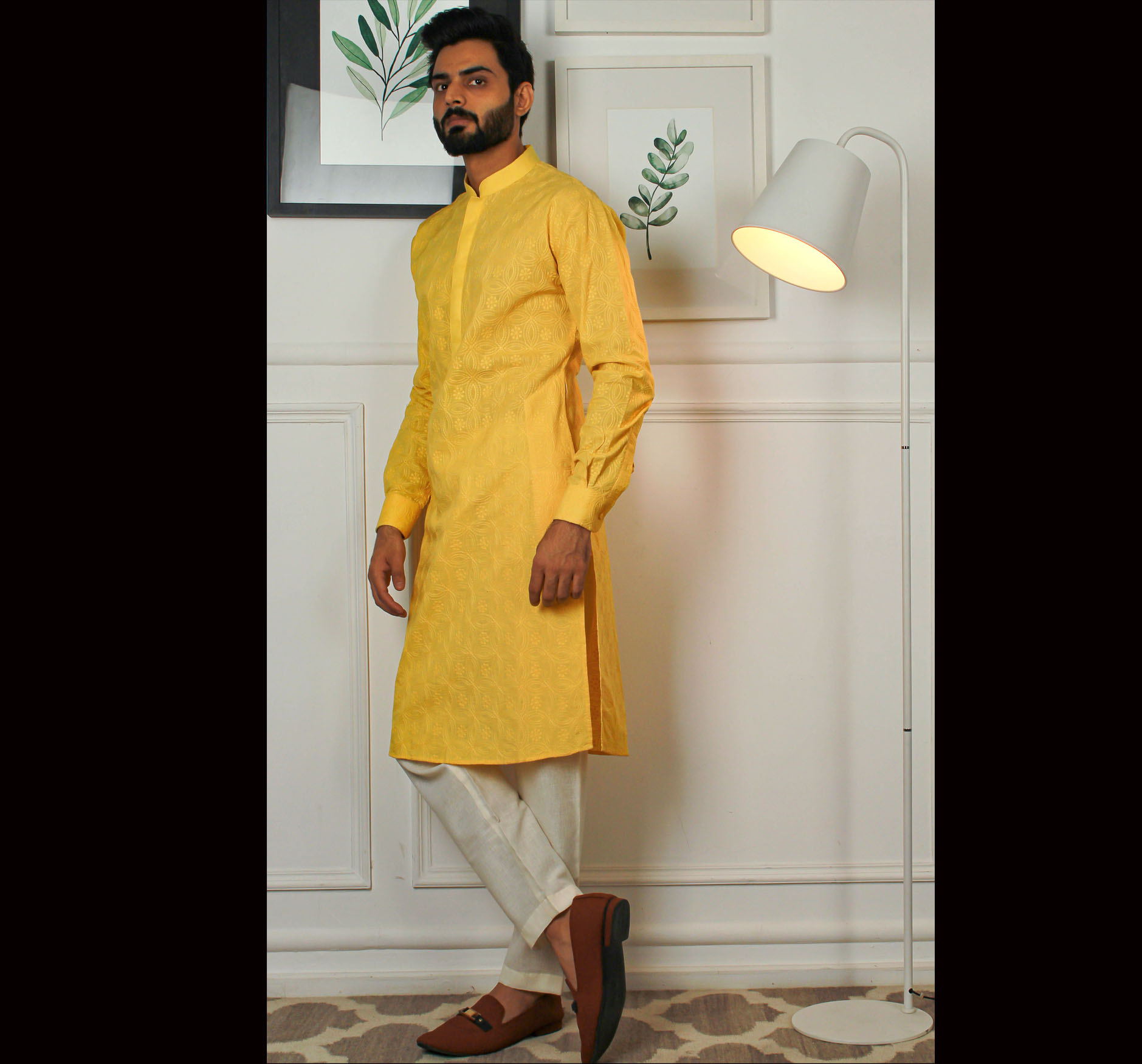 designer yellow chicken kurta for men haldi function