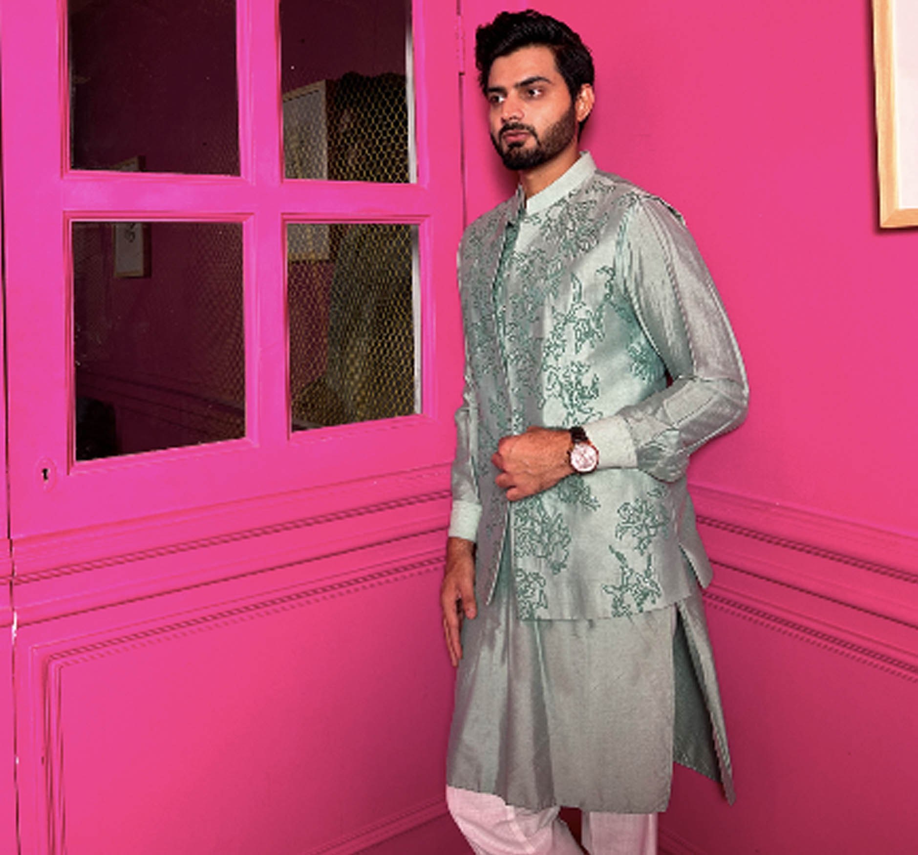 Designer Embroidered kurta pyjama jacket set for men wedding 2023